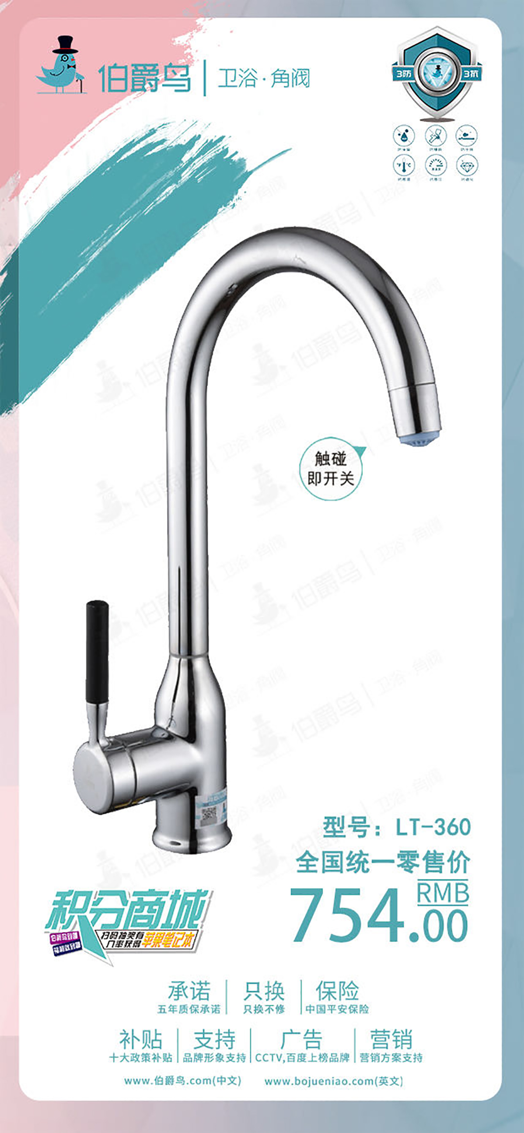 伯爵鸟卫浴精铜红冲工艺菜盆龙头触碰开关KT-360